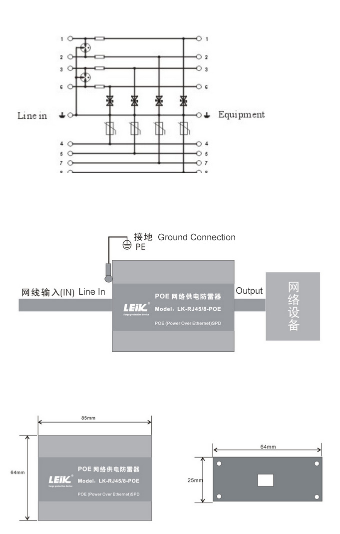 LEIK RJ45-POE SPD is designed according to IEC and ITU-T related lightning protection standards. It adopts multiple protective circuits and imports high speed protective devices. Low capacitance, Quick response speed, Low output residual, Superior transmission performance. Its interface is RJ45 shield plug. It applies to the comprehensive protection of IP cameras and all kinds of network devices’ signal terminal and power terminal. It represses high-voltage pulse and protect backend device from lightning and industrial surge damage.
