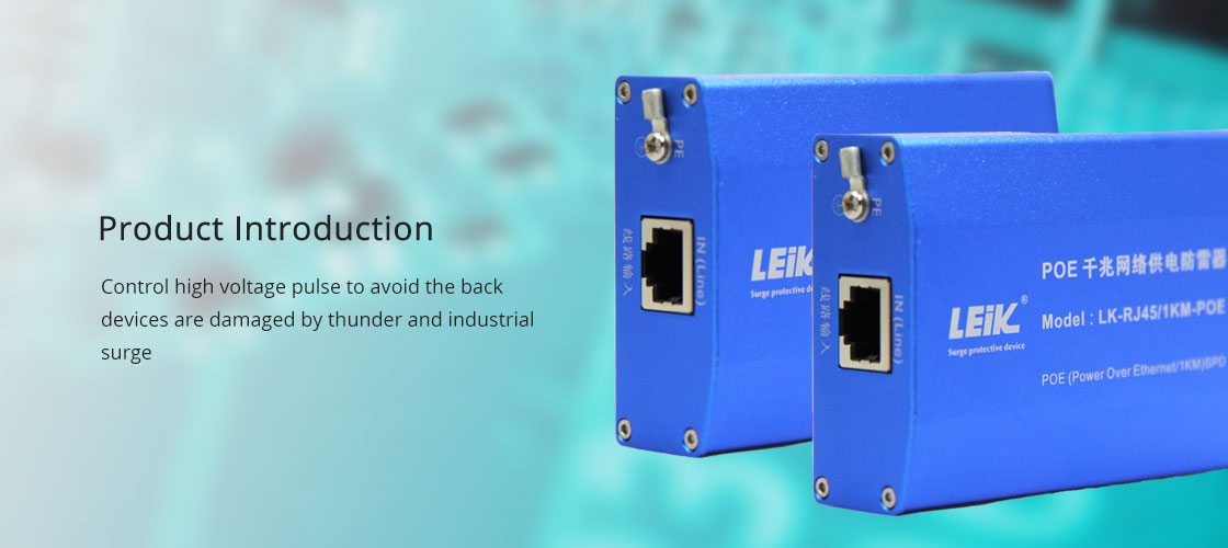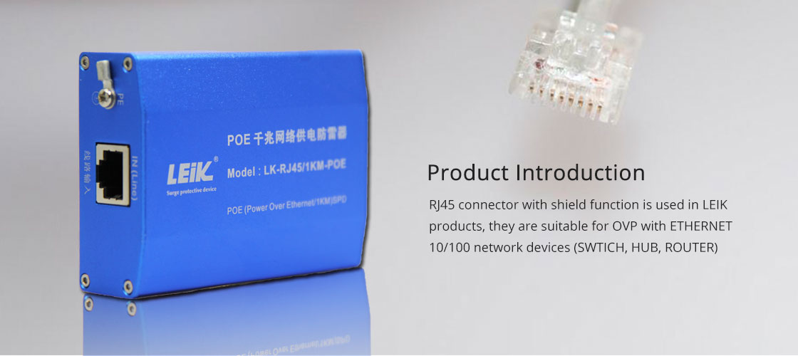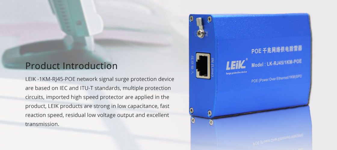 LEIK -1KM-RJ45-POE network signal surge protection device are based on IEC and ITU-T standards, multiple protection circuits, imported high speed protector are applied in the product, LEIK products are strong in low capacitance, fast reaction speed, residual low voltage output and excellent transmission. RJ45 connector with shield function is used in LEIK products, they are suitable for OVP with ETHERNET 10/100 network devices (SWTICH, HUB, ROUTER), control high voltage pulse to avoid the back devices are damaged by thunder and industrial surge.