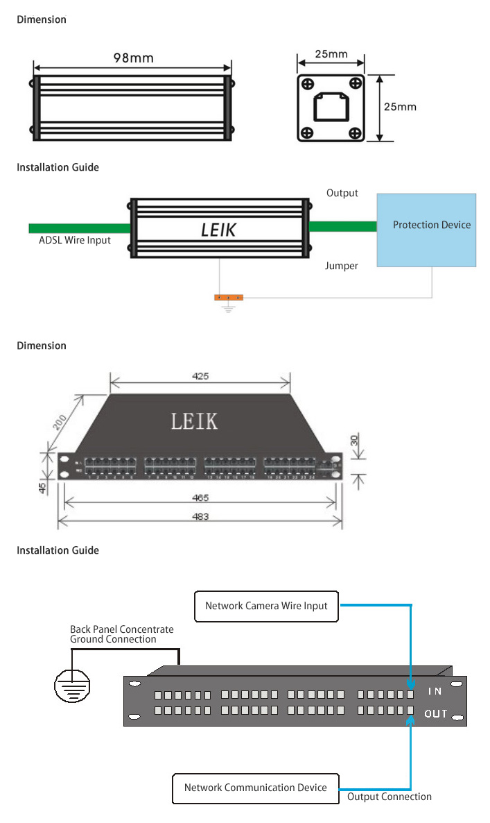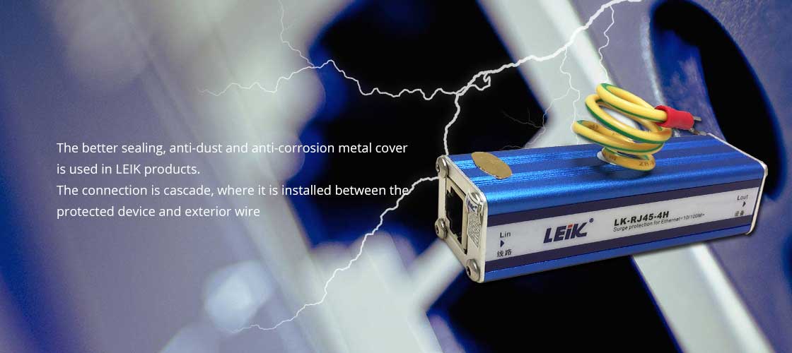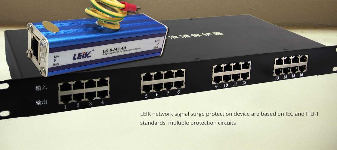 LEIK network signal surge protection device are based on IEC and ITU-T standards, multiple protection circuits, imported high speed protector are applied in the product, LEIK products are strong in low capacitance, fast reaction speed, residual low voltage output and excellent transmission. RJ45 connector with shield function is used in LEIK products, they are suitable for OVP with ETHERNET 10/100 network devices (SWTICH, HUB, ROUTER), control high voltage pulse to avoid the back devices are damaged by thunder and industrial surge.